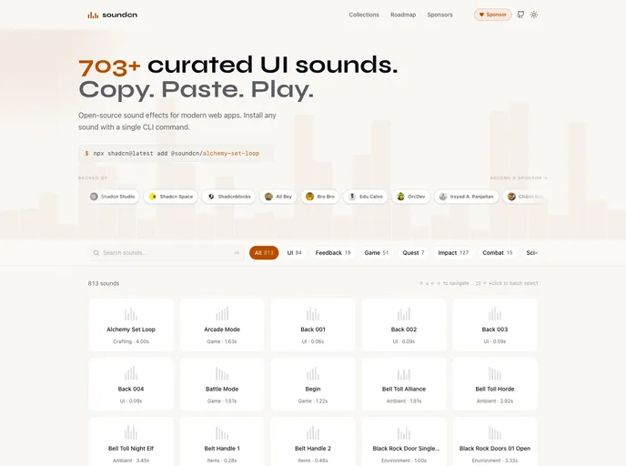 700+ curated UI sound effects for modern web apps. Browse, preview, and install sounds with a single command. Free and open source