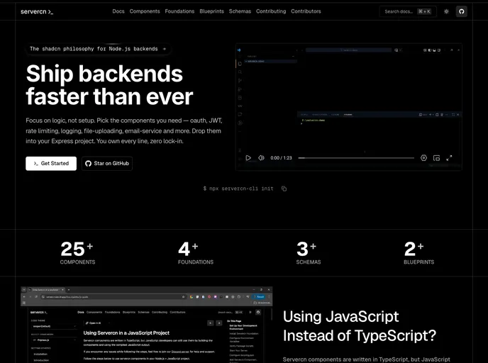 Servercn , the backend component registry for Node.js inspired by shadcn/ui. The shadcn philosophy for Node.js backend.